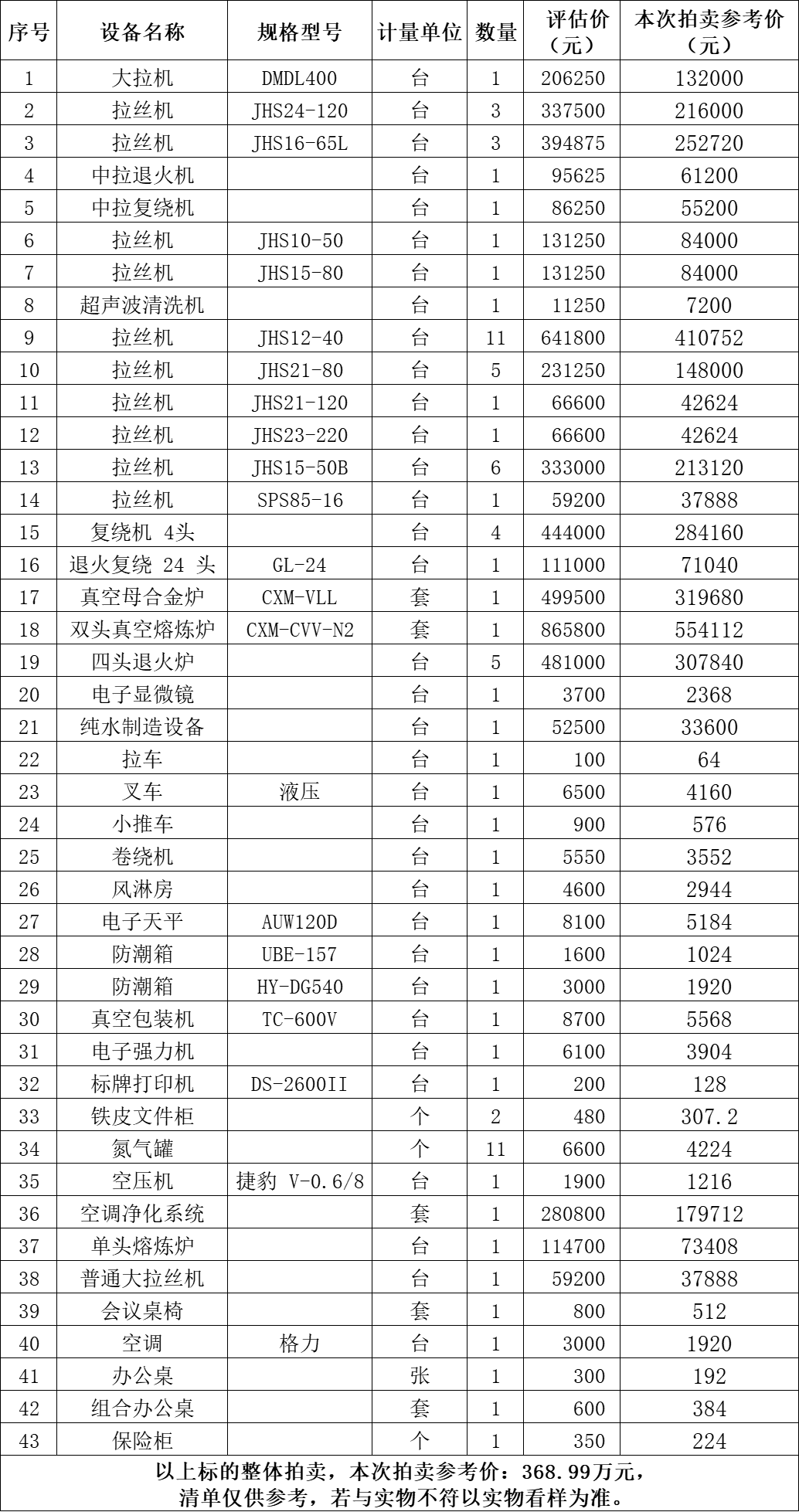 一、拍賣標的:雙頭真空熔煉爐、真空母合金爐、空調凈化系統(tǒng)、拉絲機、復繞機4頭、大拉機、單頭熔煉爐等二手設備一批,整體拍賣,參考價:368.99萬元。競買保證金:20萬元。