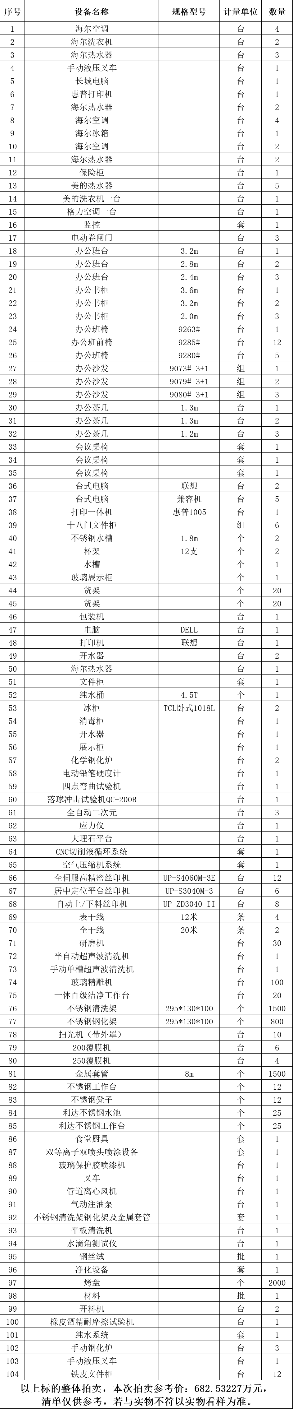 一、拍賣標(biāo)的:玻璃精雕機(jī)、自動上/下料絲印機(jī)、掃光機(jī)、凈化設(shè)備、研磨機(jī)、純水系統(tǒng)等二手設(shè)備一批,整體拍賣,參考價:682.53227萬元。競買保證金:70萬元。