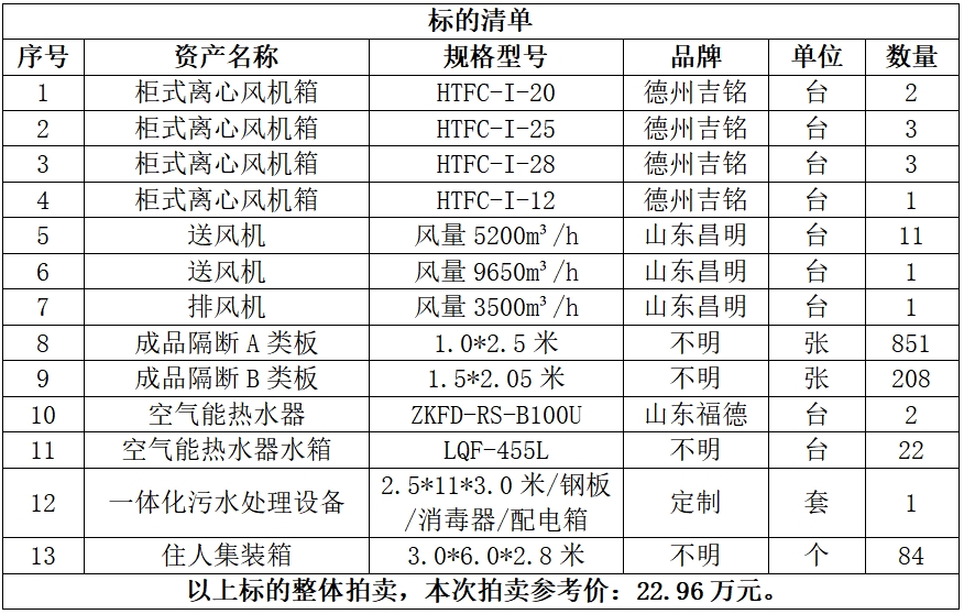 一、拍賣標(biāo)的:六安市中醫(yī)院閑置資產(chǎn)一批,包括:一體化污水處理設(shè)備、柜式離心風(fēng)機(jī)箱、空氣能熱水器、送風(fēng)機(jī)等,參考價(jià):22.96萬元,競(jìng)買保證金:5萬元。