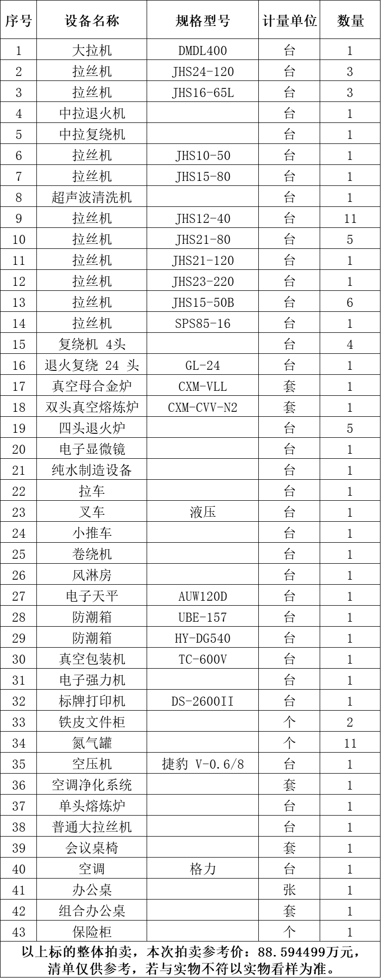 一、拍賣標(biāo)的:雙頭真空熔煉爐、真空母合金爐、空調(diào)凈化系統(tǒng)、拉絲機(jī)、復(fù)繞機(jī)4頭、大拉機(jī)、單頭熔煉爐等二手設(shè)備一批,整體拍賣,參考價(jià):88.594499萬(wàn)元。競(jìng)買保證金:10萬(wàn)元。