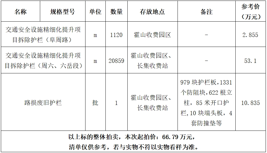 2、廢舊護(hù)欄一批,起拍價(jià):66.79萬元,競買保證金:5萬元。標(biāo)的詳情見下方所附清單: