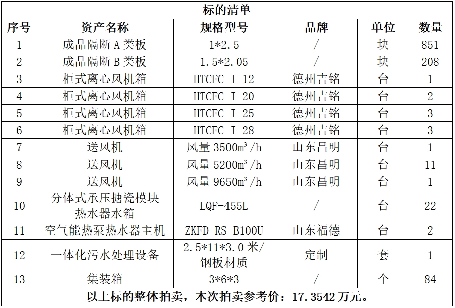 一、拍賣標的:六安市中醫(yī)院設施設備一批,包括:集裝箱、一體化污水處理設備、柜式離心風機箱、送風機等,參考價:17.3542萬元,競買保證金:2萬元。