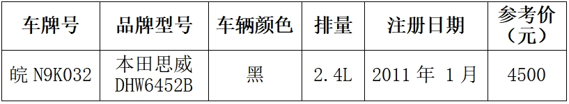 一、拍賣標(biāo)的:皖N9K032本田思威小型普通客車,參考價:4500元,競買保證金:3000元。詳見下方清單: