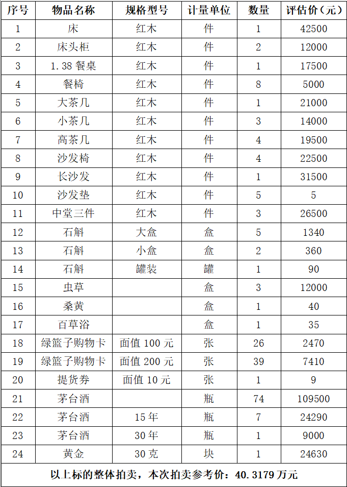 一、拍賣標(biāo)的:茅臺酒、黃金、家具等物品一批,整體打包拍賣,參考價:40.3179萬元。競買保證金:8萬元。詳見下方明細表: