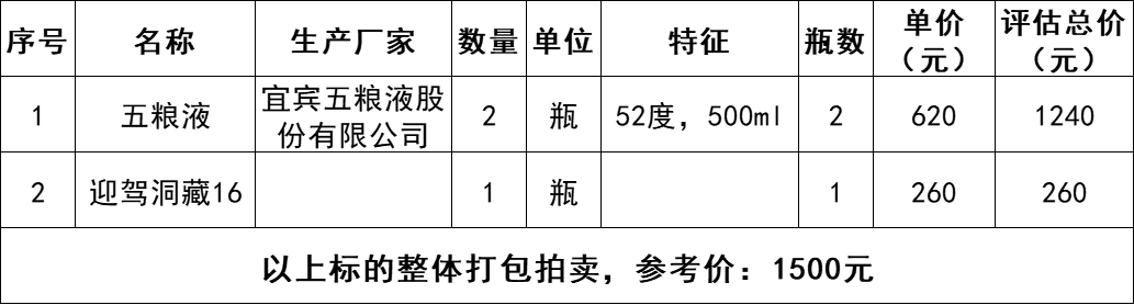 2、五糧液酒2瓶、迎駕洞藏16酒1瓶,整體打包拍賣,參考價(jià):1500元,競買保證金:1000元。標(biāo)的詳情見下方清單: