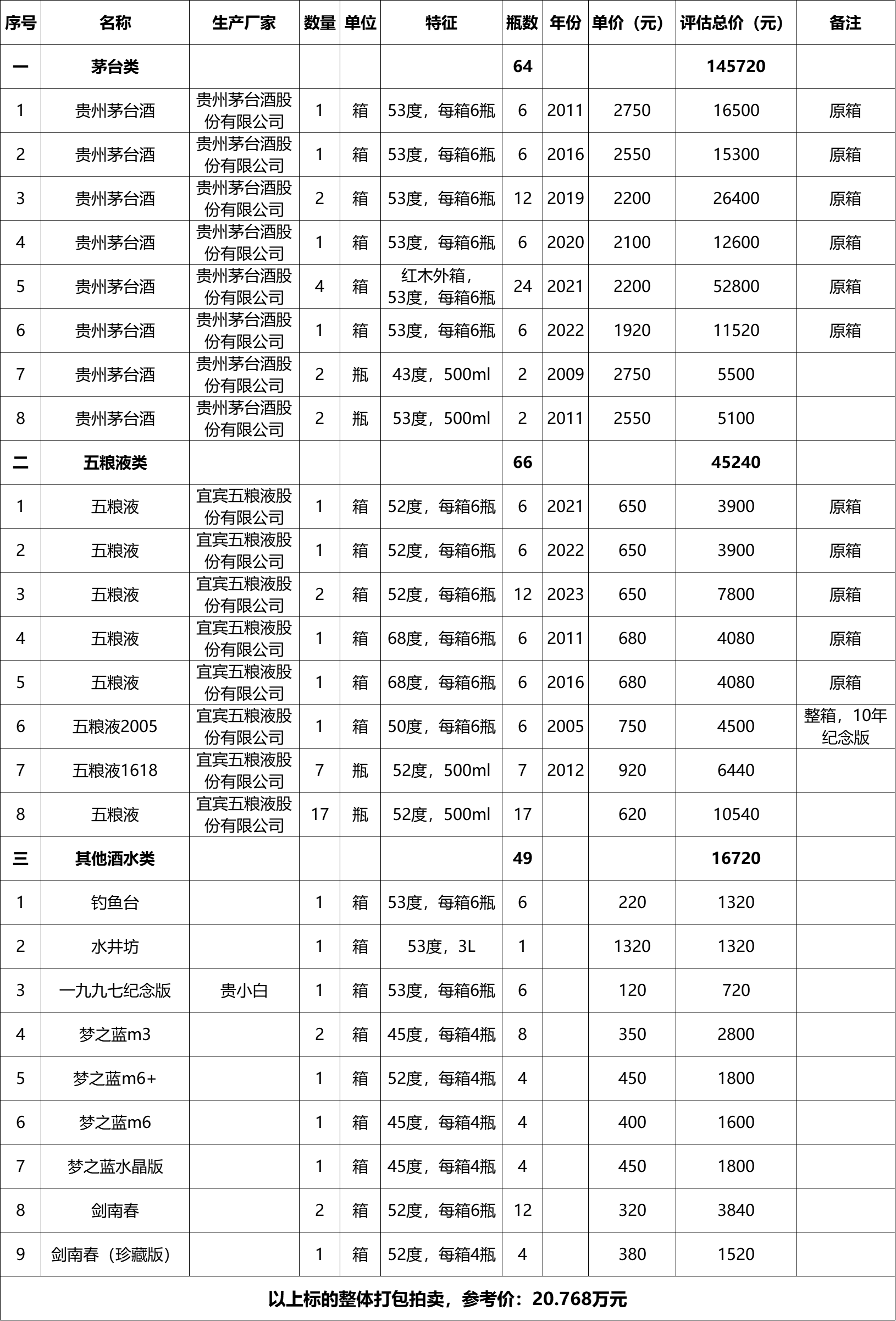 1、貴州茅臺(tái)酒計(jì)64瓶、五糧液酒計(jì)66瓶及其他類酒水計(jì)49瓶,整體打包拍賣,參考價(jià):20.768萬元,競買保證金:2萬元。標(biāo)的詳情見下方清單: