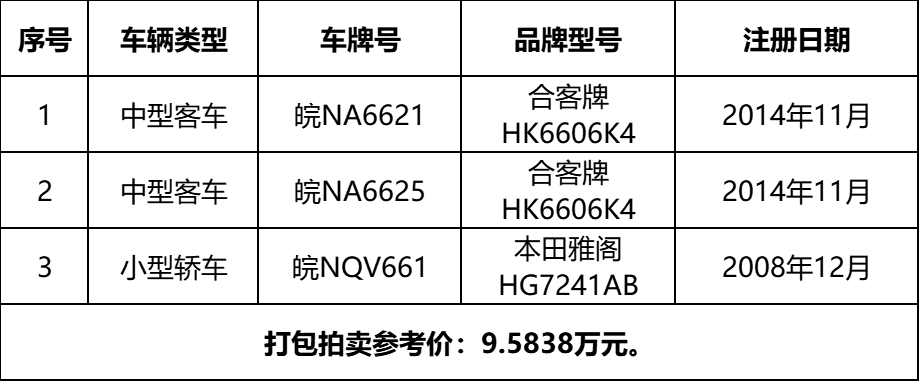 3、皖NA6621合客牌中型客車、皖NA6625合客牌中型客車、皖NQV661本田雅閣小型轎車等3輛二手車,打包拍賣。參考價:9.5838萬元,競買保證金:1萬元。標的詳情見下表:
